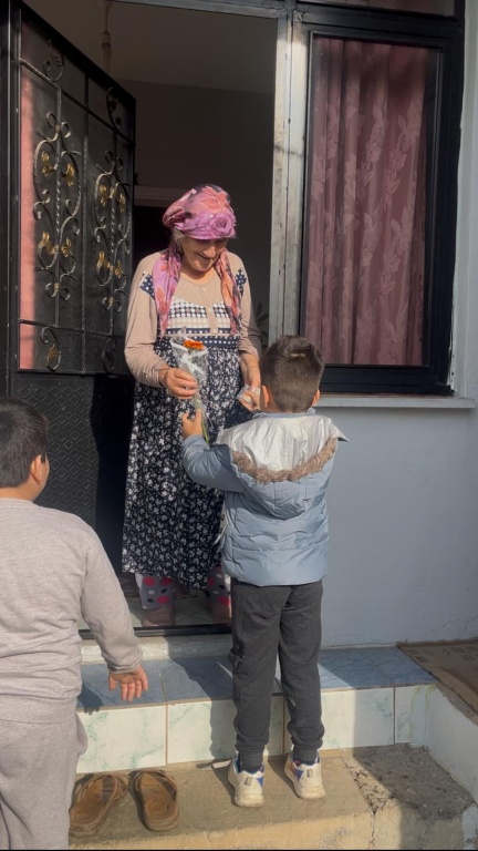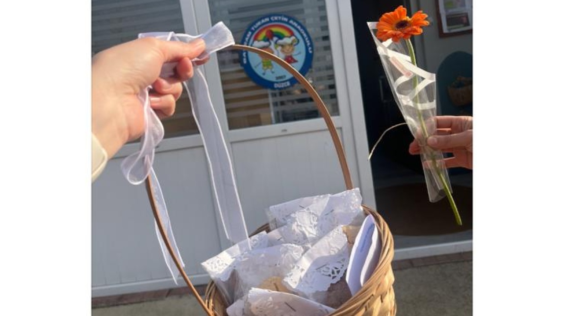 Çiçekler ve minik iyilik notları da hazırlanarak çocuklarımızla beraber okulumuzun sokağına çıkıp yoldan geçen, durakta bekleyen, bisiklet süren insanları ummadıkları anda durdurup kurabiye, çiçek ve iyiliknotları vererek güzel sözler söyleyip sohbet ettik. İnsanların yüzündeki tebessümlere şahit olduk.